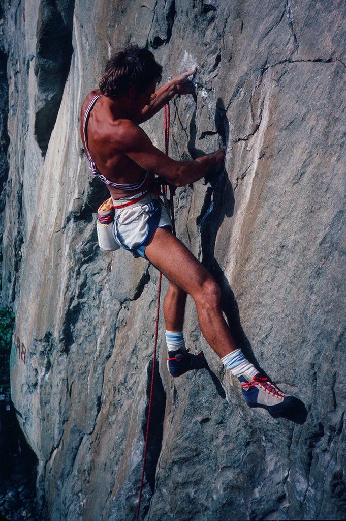There was one pic of Steve on top of a climbing pitch. He’s shirtless, in corduroy climbing shorts (the kind that Patagonia used to sell) with a climbing harness, a rack of carabiners and pitons across each shoulder, climbing hammer at his hip, tan skin, an unkempt beard and long sun bleached hair held back by a bandana around his forehead.