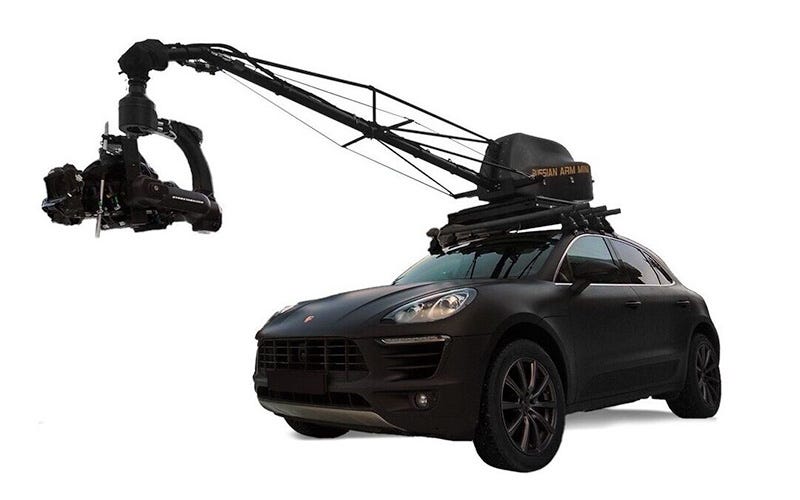 A Russian Arm (what some have taken to calling a U-Crane, since it was invented in Kiev) is a camera car system. It’s usually a modified Porsche Cayenne SUV. It has a stabilized crane on the roof that rotates 360 degrees and can move so the camera almost touches the road to near vertical. At the end of the crane is a gyro stabilized “head” that holds the camera.