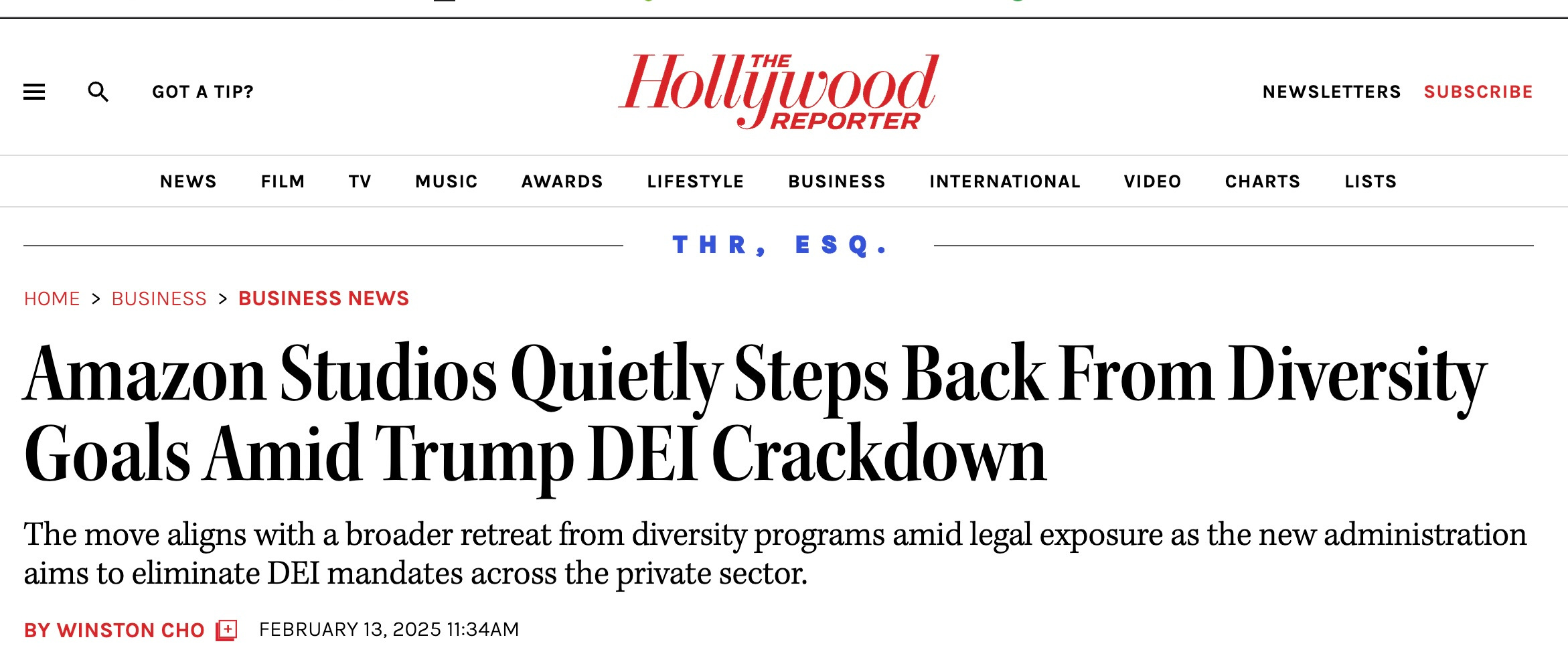I saw this item in the Hollywood Reporter. It seems that Amazon Studios is ending it’s DEI program. The article also mentions Disney is doing the same.